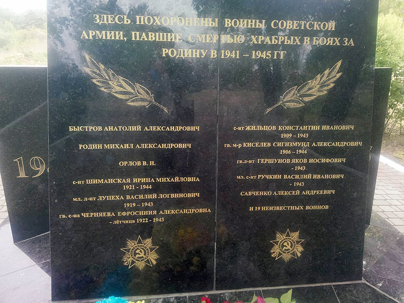 А неподалік, на чорних гранітних плитах — імена, імена. “Младший лейтенант Лупеха Василий Логвинович…», «сержант Шиманская Марина Михайловна…», «гвардии старшина Черняева Ефросиния Александровна…»