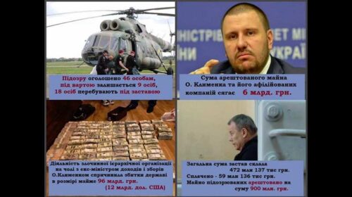 Сума арештованого майна колишнього міністра доходів і зборів часів Януковича Олександра Клименка та його дочірніх компаній сягає 6 мільярдів гривень. Про це повідомив Генеральний прокурор Юрій Луценко. “У ході розслідування справи злочинної організації О. Клименка підозру оголошено 46 особам, серед яких керівники регіональних податкових, а також сам екс-міністр доходів і зборів О. Клименко. Під вартою залишаються 9 осіб, ще 18 осіб перебувають під заставою на загальну суму 59 млн грн. Майно підозрюваних арештовано на суму 900 млн грн. Сума арештованого майна О. Клименка та його афілійованих компаній сягає ще 6…