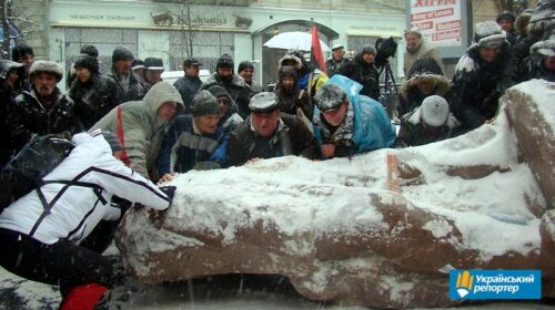 Історична подія сталася 8 грудня 2013 року в Києві. Патріотично налаштовані українці скинули з п’єдесталу більшовицького тирана Ульянова (Леніна). Це було однією із знакових віх Революції Гідності. Упродовж 2009—2013 років було кілька спроб демонтажу пам’ятника. Перша спроба – влітку 2009 року року (30 червня): ідолу було відбито ніс і руку, проте його зазомбовані прихильниики згодом відновили пошкоджене… Шість років тому еніна, який стільки горя і страждань приніс українцям, було повалено. Фото “Українського репортера” Like