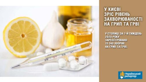 У столиці за 7-й тиждень 2020 року зареєстровано 15 340 хворих на грип та ГРВІ. Про це повідомляється на сайті КМДА. “Загалом інтенсивність епідемічного процесу перебуває на низькому рівні, який не потребує введення додаткових заходів, та є нижчою базової лінії на 32,3%. Наразі показник захворюваності становить 519,9”, – зазначив перший заступник голови КМДА Микола Поворозник. Загалом у столиці спостерігається зростання захворюваності на грип та ГРВІ на 0,9% у порівнянні з попереднім тижнем, яке відбулося за рахунок дорослого населення. Дітей захворіло – 9 653 (зниження на 1,5%), дорослих – 5687 особи…