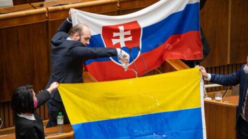 У парламенті Словаччини депутат від ультраправої партії Андрей Медвецьки вилив на прапор України воду під час засідання. Про це повідомляє InfoPost. Словацькі депутати у вівторок зібрались на позачергове засідання, на якому було заплановано затвердити оборонну угоду зі США. Депутати від проросійських партій SMER та “Народної партії Наша Словаччина” постійно зривали засідання і не давали виступати представникам провладних партій та влади. Депутати від ультраправої партії “Народна партія Наша Словаччина” Петер Крупа та Андрей Медвецьки заблокували трибуну і розтягнули перед мікрофоном прапор Словаччини. Натомість представники партії Свобода та Солідарність (SaS) Яна Циганікова…