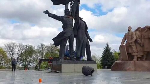 У Києві біля Арки дружби народів демонтували радянську бронзову скульптуру двох робітників, яку було встановлено в 1982 році «на ознаменування возз’єднання України з росією». Саму Арку перейменують на Арку свободи українського народу. Про це мер Києва Віталій Кличко написав у Telegram-каналі. «Своє ставлення до України росія «ознаменувала» варварським прагненням знищити нашу державу і мирних українців. 8 метрів металу так званої «дружби двох народів» демонтуємо. І що символічно – коли скульптуру намагалися підійняти краном, відпала голова у російського робітника, – написав Віталій Кличко. – Другу скульптурну композицію, встановлену поруч, поки закриємо…