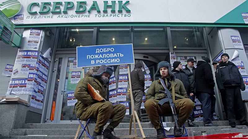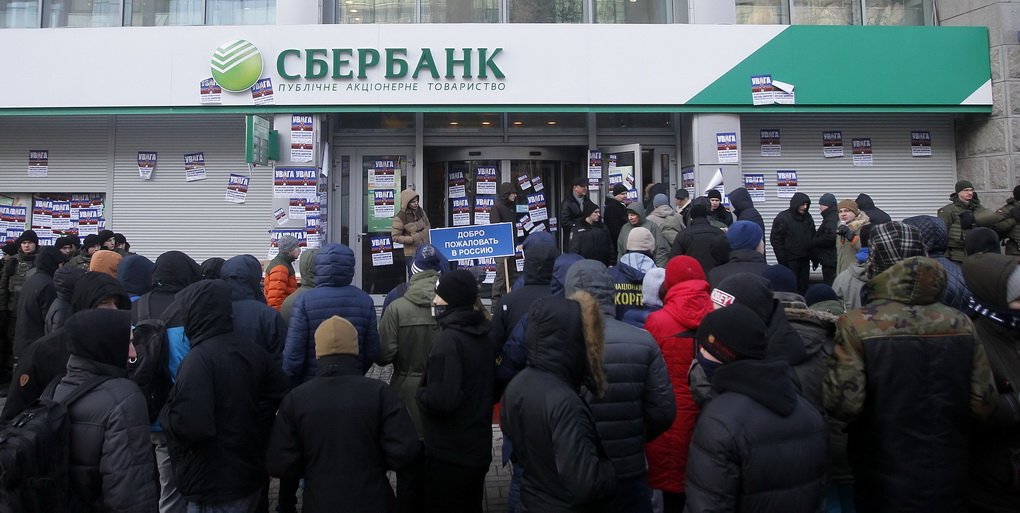 Активісти проти російських банків. Зранку 30 січня в Києві біля низки центральних офісів дочірніх компаній російських банків (“Сбербанк России”, Промінвестбанк, ВТБ-Банк, БМ-Банк та Альфа-Банк) було гаряче. Їх пікетували активісти політичної партії «Національний корпус».