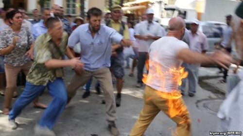 Як повідомляє портал Крим.Реалії, активіст «галявини протесту «Стрілецька» заявив, що здійснює акт самоспалення на знак протесту проти свавілля влади. Він облився горючою рідиною та підпалив себе. Довколишнім удалося збити вогонь з його одягу. Жителі «галявини протесту «Стрілецька», які напередодні протестували проти будівництва паркану, сьогодні прийшли до підконтрольної Кремлю Сімферопольської міськадміністрації та зажадали зустрічі з керівниками міста. «Галявина протесту «Стрілецька» – район, де мешкають переважно кримські татари. На місці їхніх будинків збираються звести житловий комплекс. Фото Крим.Реалії Like