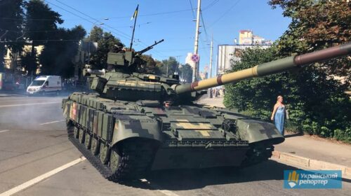 Суттєва підмога фронту – наші військові частини поповнить броньований “кулак”. — Танки Т-80 та Т-64 повністю відновлені на Харківському бронетанковому заводі та зовсім скоро стануть на захист країни. П’ять новеньких БТР-4 — це робота КБ ім. Морозова. Також «Укроборонпром» продемонстрував новітні зразки озброєння: реактивну систему залпового вогню «Верба», ракетний комплекс «Сапсан», створений разом з іншими підприємствами ОПК України, та БТР-4МВ1, створений з урахуванням конструкторських рішень країн-членів НАТО. Про це Президент України — Верховний головнокомандувач Збройних Сил України Петро Порошенко повідомив на своїй сторінці у Фейсбуку. На фото: 2018 рік, Київ. Танки йдуть на тренування до військового параду. Фото “Українського репортера” Like