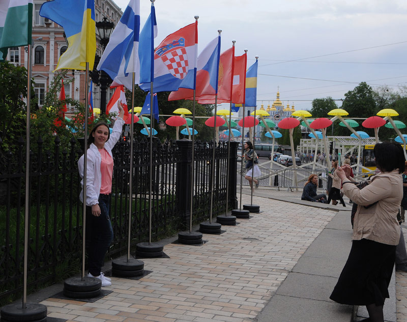 А головний пам’ятник площа – Богдану Хмельницькому – увесь в прапорах. Довкруж встановлено 42 стяори іноземних держав – учасниць Євробачення.