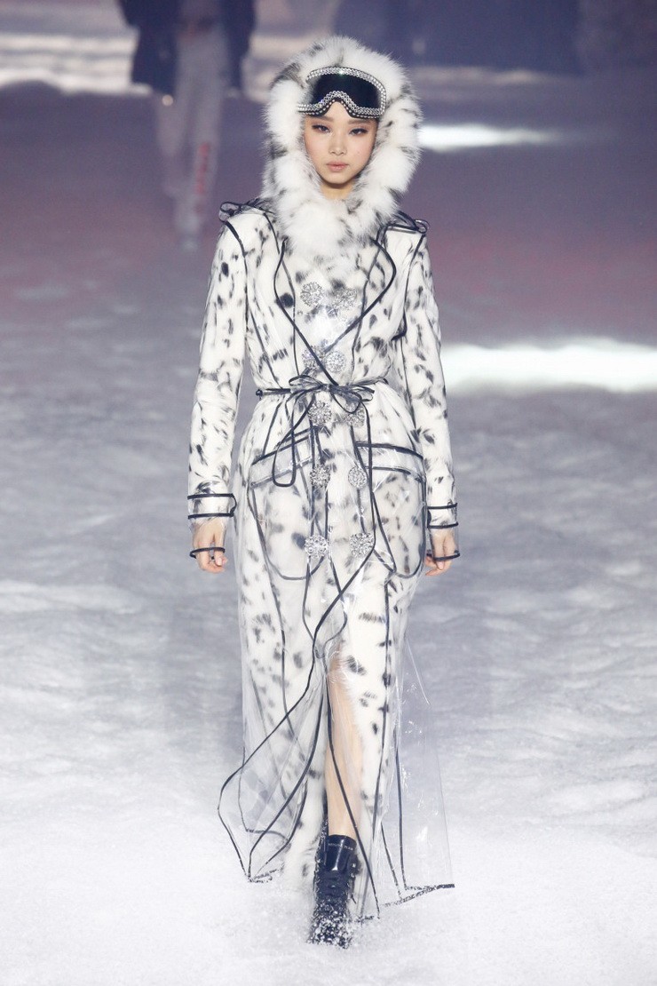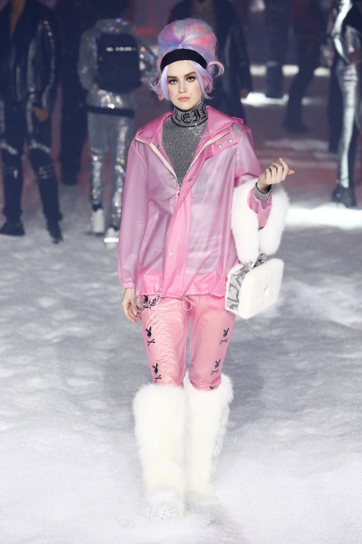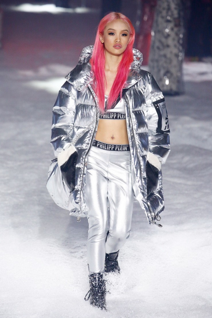 Модельєр як завжди дивує епатажністю образів, великою кількістю блиску та відвертістю. У колекції представлені образи для відпочинку в горах: сріблясті, рожеві та чорні пуховики, довгі боти із хутра, сноуборди зі стразами – все це і справді схоже на іншу планету.