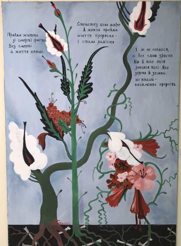 Повернемо нашу розповідь до харківської школи художників. У Харкові жила та працювала мисткиня Катерина Ткаченко (сьогодні мешкає в Чикаго). Пані Катерина була учасницею Помаранчевої революції та Революції Гідності. Під час Майдану 2013–2014 років вона долучилася до Мистецької сотні, брала участь в акції “Щитопис” та курувала пленер “На барикадах”. В галереї «АВС-арт» представлено її роботу «Правда життя», тему якої підсилють вірші на полотні.
