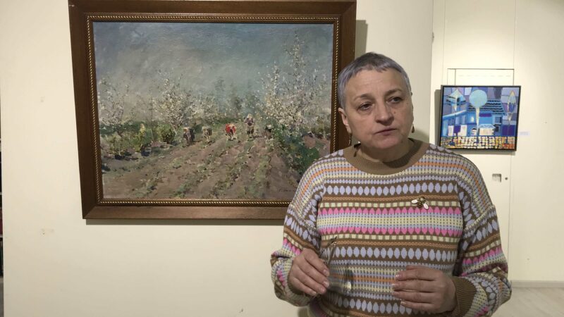 Сьогодні у галереї представлено близько півсотні картин – це вибрані твори зі згаданих трьох проєктів, розповідає нам артдиректор галереї, мистецтвознавець Алла Маричевська. «Вирішили зробити такий ось підсумок усього, чим ми займалися упродовж чотирьох воєнних років, – говорить пані Алла. – Ці твори – про всю нашу красу, в яку ми закорінені, в яку заглиблені. І яка дає нам силу. Ось, будь ласка, наша Чернігівщина, чарівна Десна. І наш Довженко, – веде розповідь Алла Володимирівна (на світлині), акцентуючи увагу на картині Володимира Ємця, який жив і творив на сіверській землі.