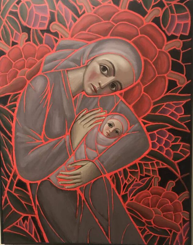Оглядаючи експозицію не можемо не зупинитися на серії робіт з тематичного циклу «Мадонни». «Мадонни» є духовною вершиною творчості Олександра Івановича. Ще перед війною, взимку 2022-го, художник почав писати свою «Мадонну», яка мала назву «Щаслива». Як розповідав нам живописець, «Мадонна» мала бути в чарівних квітах, усміхнена, сяюча. Але зобразити «Мадонну» усміхненою та щасливою не вдавалося, вона поставала на полотні сумною. Тоді художник приступив до нової картини – і також до «Мадонни», яку назвав «Неспалимою».