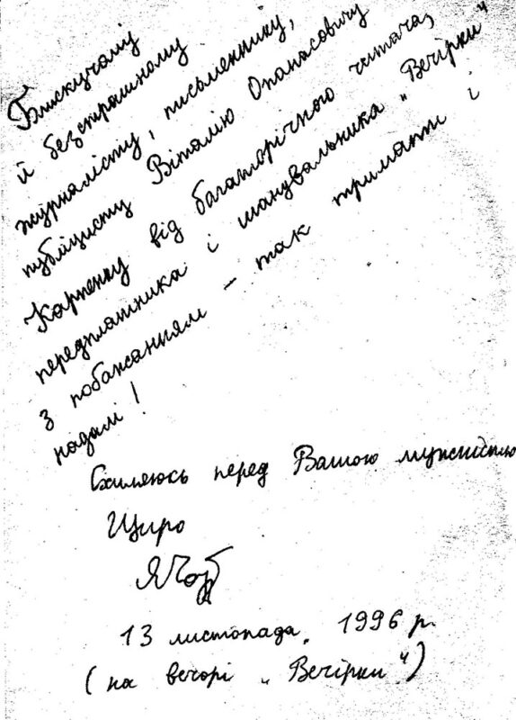Ні на йоту не сумніваюсь у щирості цього автографа, та навів його не для власної втіхи, а для того, щоб підкреслити щирість, безпосередність і патріотичну спрямованість Олегового нащадка. «Вечірка» та її редактор тоді були на слуху: українці, думаючі кияни поділяли нашу патріотичну позицію і саме це спонукало Ярослава написати такий автограф.