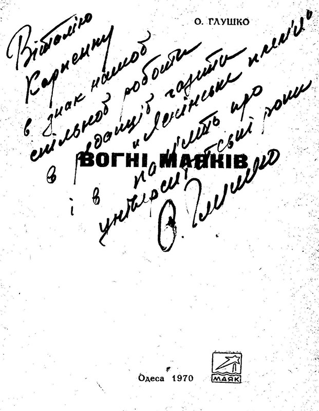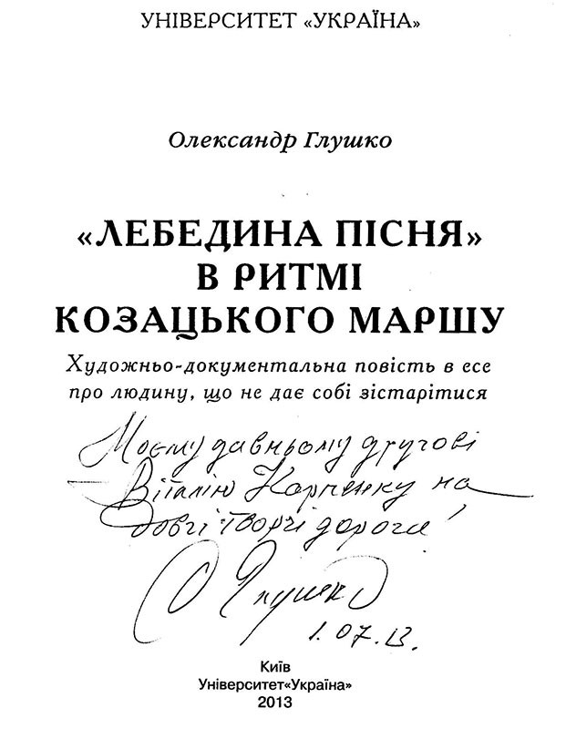 Хоча у творчому відношенні роки спільної праці були досить плідними. І не випадково, а цілком усвідомлено я взяв для цих заміток його книгу «Лебедина пісня в ритмі козацького маршу». Це художньо-документальна повість в есе про Петра Таланчука – дивовижну людину, відомого вченого, вмілого організатора, заслуженого діяча науки, засновника і керівника Відкритого міжнародного університету «Україна». Книга написана винахідливо, по-новаторськи, з властивою Глушкові глибиною. Її я маю з автографом автора.