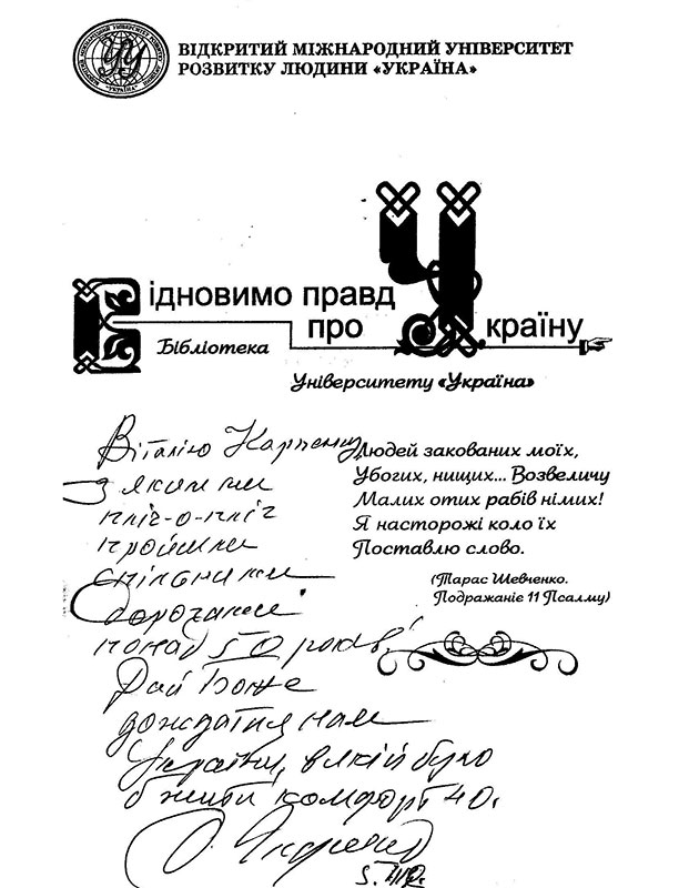 Нам довелося разом працювати на одній кафедрі в Університеті «Україна». Так розпорядилася доля, що через недолугу урядову політику в той час ми обидва змушені були піти з цього університету.