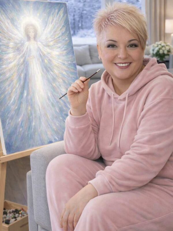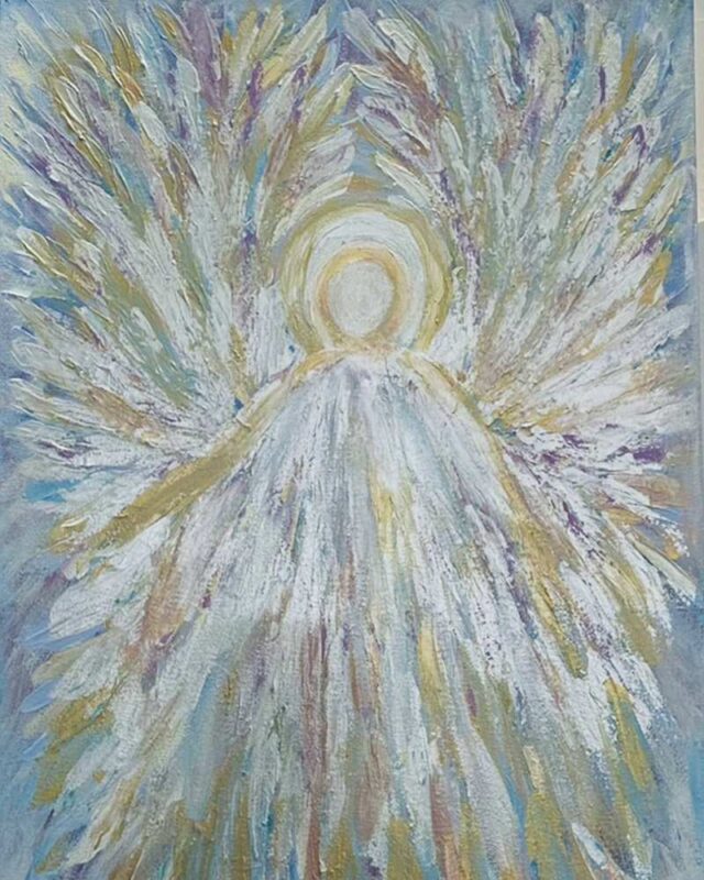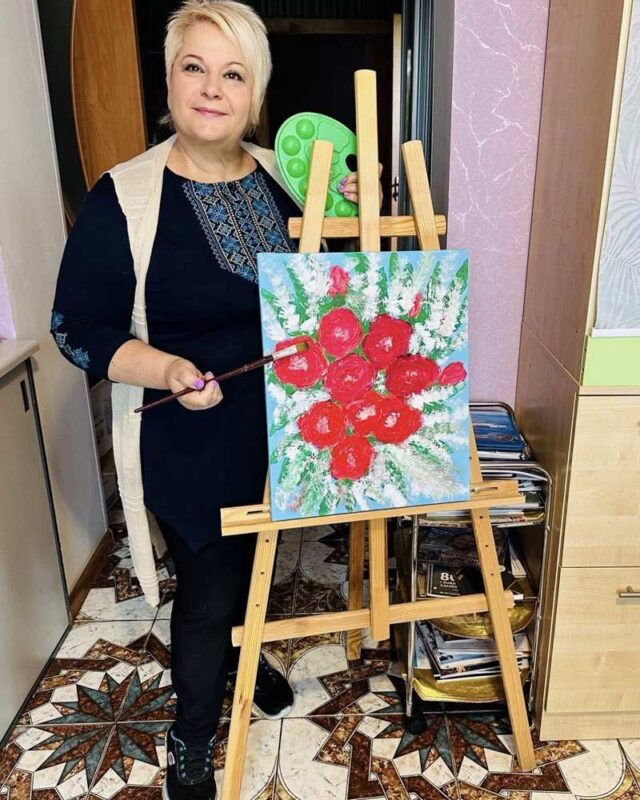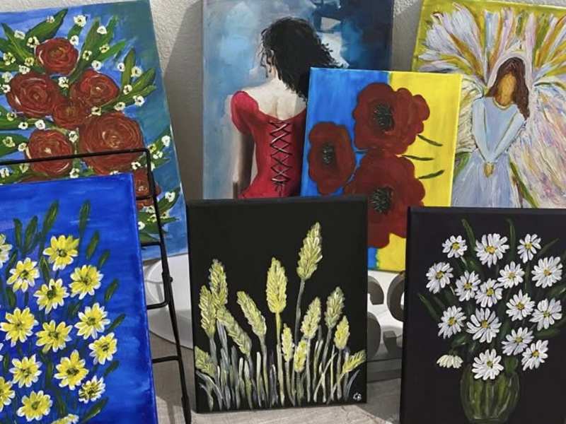 «Що малюю?– перепитує пані Світлана. – Квіти, янголів. Останнім часом узялася малювати ікони (обожнюю їх) у світському стилі. Ще з дитинства я відчула потяг до мистецтва. Перед широкомасштабним російським вторгненням взяла декілька уроків у художника і під час війни почала малювати абстрактні картини». (На фото ниже).