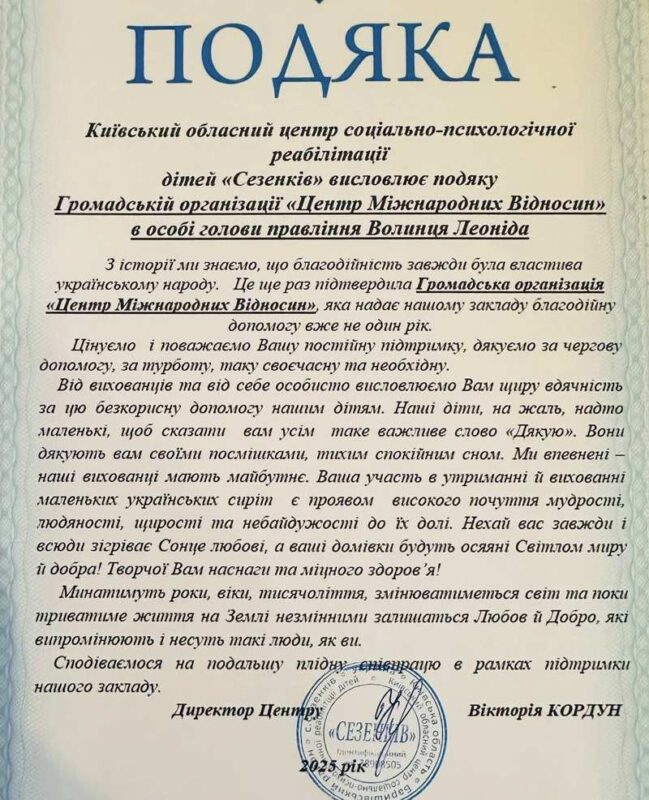 У 2025 році Центр міжнародних відносин підписав меморандуми з такими потужними організаціями, як Інститут розвитку громадського суспільства імені Голди Меїр, видавництвом «Адеф-Книга», Міжнародним жіночим рухом «За сімейні цінності», Благодійним фондом «Нескорена Україна 24.02.».
