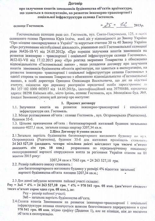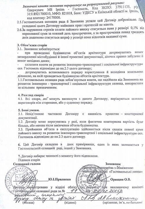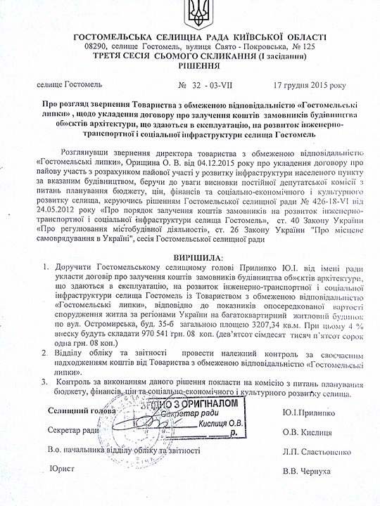 “Про розгляд звернення ТОВ «Гостомельські липки» щодо укладення договору про залучення коштів замовників будівництва об’єктів архітектури, що здаються в експлуатацію, на розвиток інженерно-транспортної і соціальної інфраструктури селища Гостомель (будівництво багатоквартирного житлового будинку по вул. Остромирській, буд. 35-б в селищі Гостомель)”.