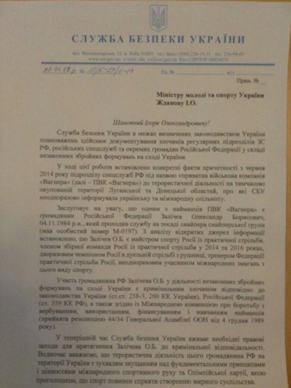 СБУ надіслала листа міністру молоді та спорту України Ігорю Жданову з проханням донести інформацію про участь чемпіона Росії у терористичній діяльності на Донбасі до спортивних федерацій країн-партнерів.