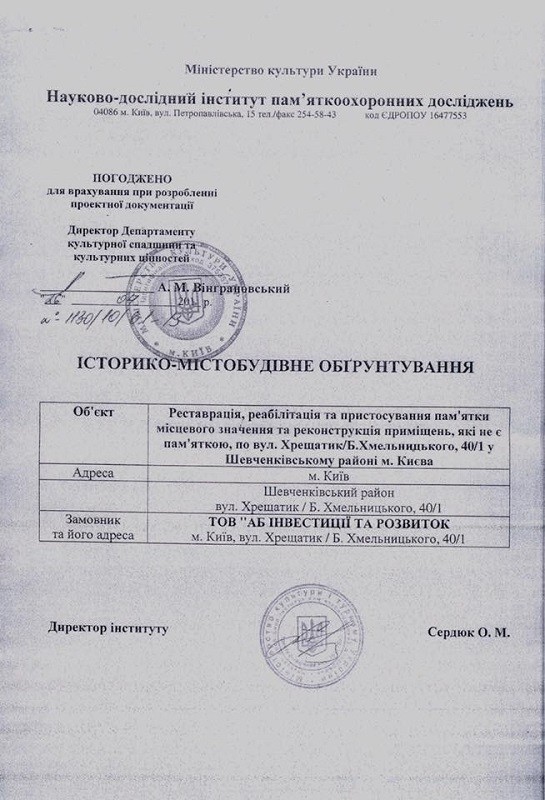Висновок: неможливо дозволити зняти статус пам’ятника архітектури, нехай власник відновлює будівлю у наявних параметрах!” – написав у Фейсбуку радник мера Києва Дмитро Білоцерковець.