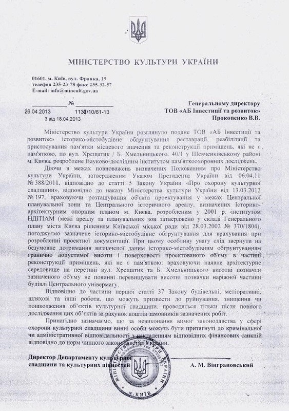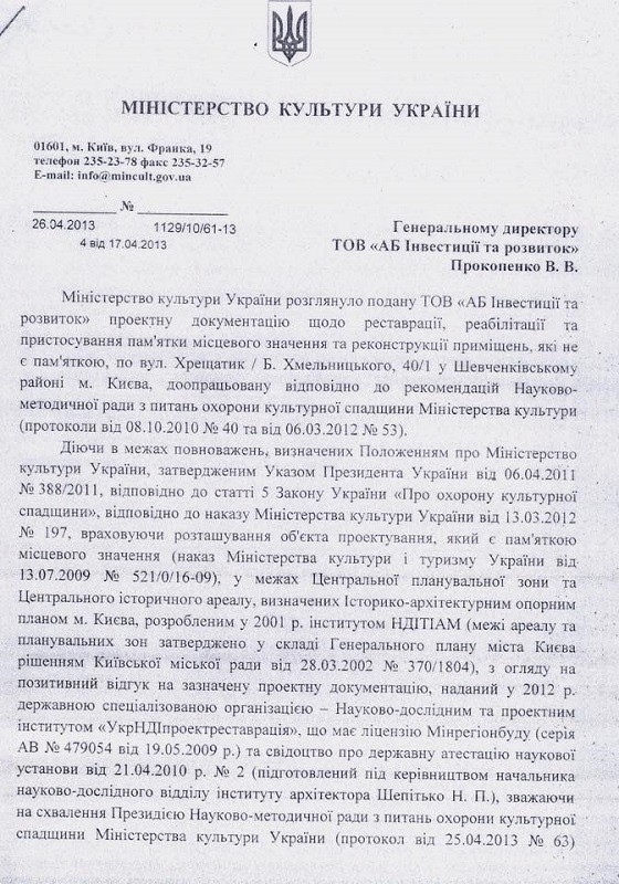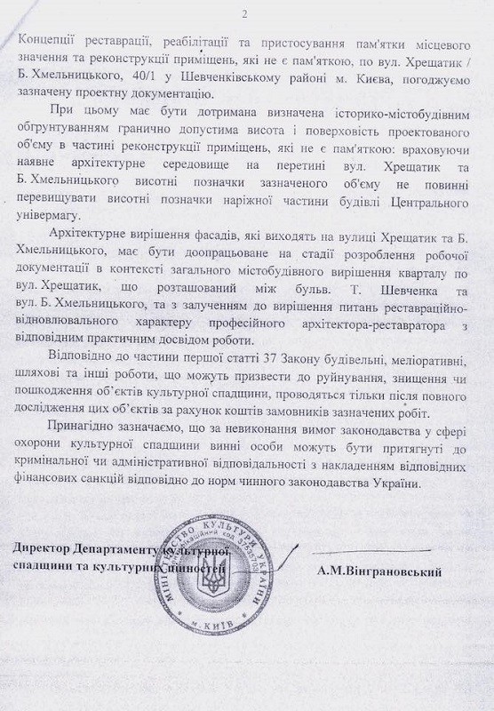“Об’єднання громадських організацій “Київське Віче” вимагало повернути будинок по вул. Хрещатик 40/1, а також ділянку 0,15 га, на якій він розташований, у власність міста (зі скасуванням дозволу, наданого компанії “АБ Інвестиції та розвиток” на надбудову офісно-торгового центру), здійснити реставрацію зазначеного об’єкта, який є пам’яткою архітектури місцевого значення, та повернути йому попереднє цільове призначення (гастроном)”, – написала активістка у Фейсбуку.