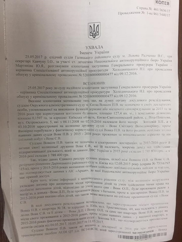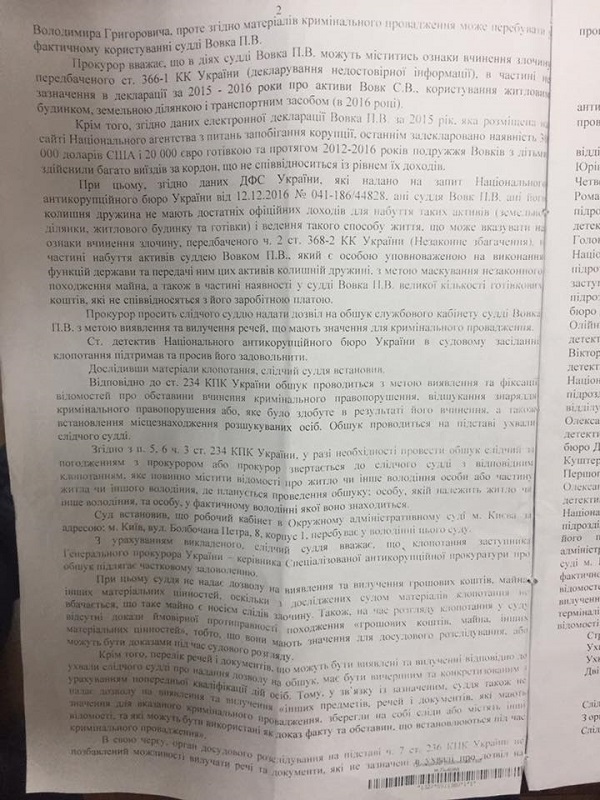 “Обшуки проводяться в рамках розслідування кримінального провадження на підставі аналізу е-декларації за фактом ймовірного незаконного збагачення Голови ОАСК Вовка. Розслідування за фактом незаконного збагачення голови ОАСК розпочато детективами НАБУ 9.12.2016.