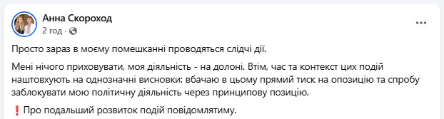 В медіа висловили припущення, що йдеться про депутатку Анну Скороход. Згодом парламентарка підтвердила у Фейсбуку, що у її помешканні проводять слідчі дії.