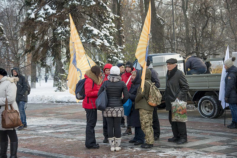 Зранку в середу, 15 листопада, в центрі Києва почали збиратися групи, групки й колони людей. На початку вулиці Грушевського й між Майданом і Європейською – дорослі чоловіки в камуфляжі з шевронами «Об’єднання воїнів АТО «Солідарність». Є чоловіки в цивільному. Стоять під державними прапорами. На лавочці біля «Двох гусей» молодик розпаковує пачки з газетами. Відчувається, що тут є командири (і не паркетні, а бойові).