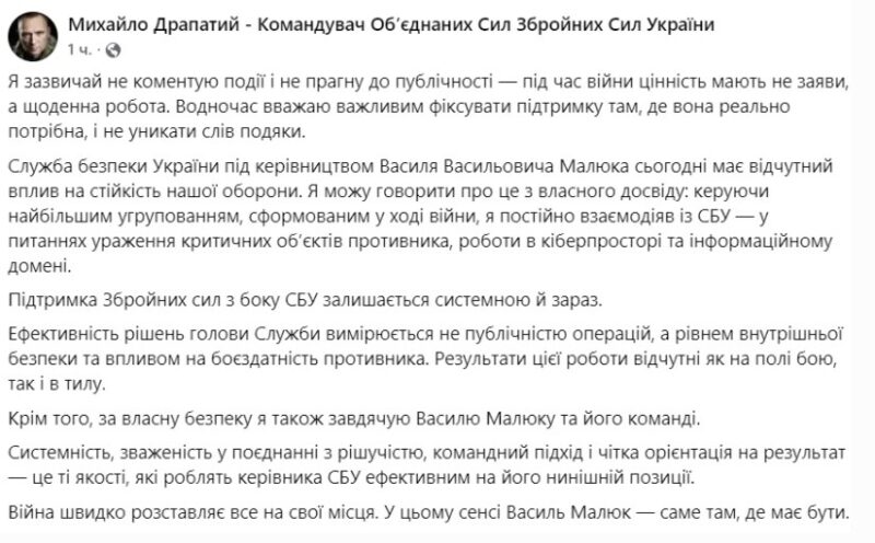 “Війна швидко розставляє все на свої місця. У цьому сенсі Василь Малюк саме там, де має бути”, – сказав Драпатий.