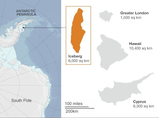 На заході Антарктиди відкололася гігантська частина льодовика Ларсен С, у результаті чого утворився один із найбільших айсбергів в історії. Його вага – трильйон тонн, а площа – майже 6 тисяч квадратних кілометрів, що можна порівняти з чвертю Криму.