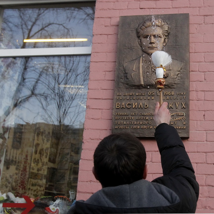 Колись, за Союзу, саме тут, на Хрещатику, 27а, майже півстоліття тому, 5 листопада 1968 року Василь Макух ціною власного життя висловив свою громадянську позицію проти тоталітарного комуністичного режиму, окупації України та Чехословаччини. Він спалив себе. Охоплений полумям вигукнув: “Геть окупантів!”, “Хай живе вільна Україна!”, “Геть з окупованої Чехословаччини!”