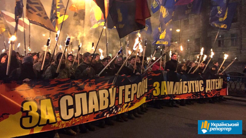 Під таким гаслом у Києві пройшла велелюдна смолоскипна хода на честь Степана Бандери. У ній узяли участь до п’яти тисяч активістів партій націоналістичного спрямування – “Свободи”, Правого Сектору, Національного корпусу “Азов”. Серед відомих діячів “Український репортер” побачив народного депутата Андрія Іллєнка, депутата Київради Юрія Сиротюка…