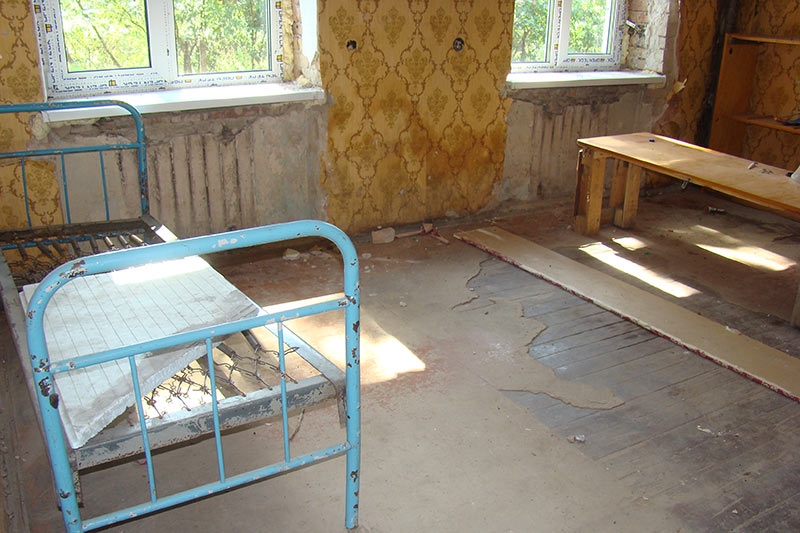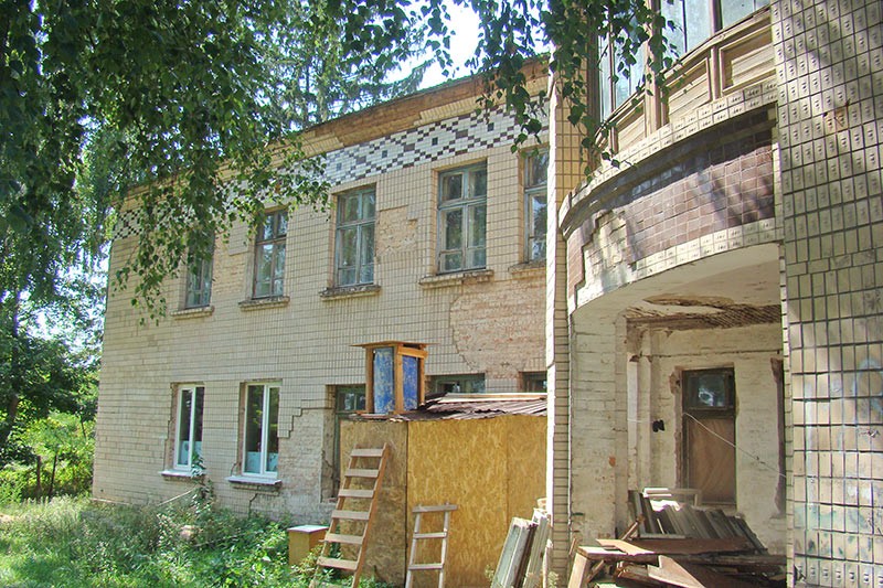 В конторських приміщеннях — суцільний гармидер, видно, що триває якийсь ремонт. Тут, схоже, днюють-ночують робітники. Деякі вікна забиті дошками. Під стіною притулилася саморобна буда-лазня.