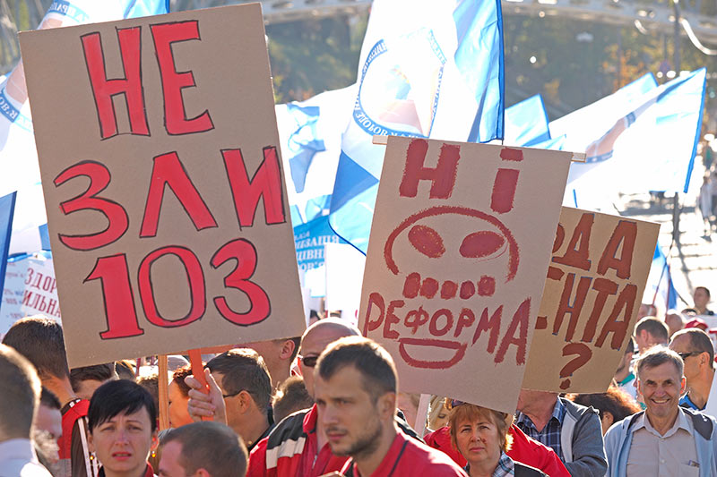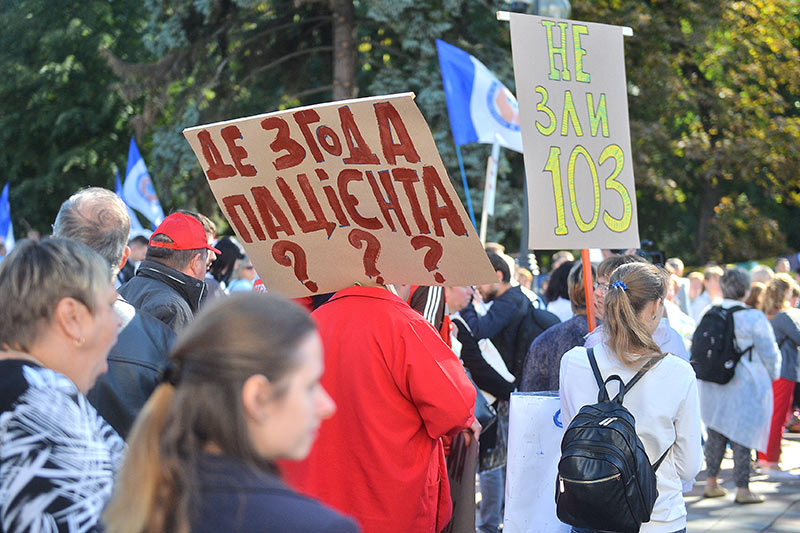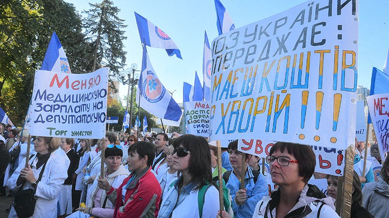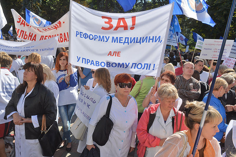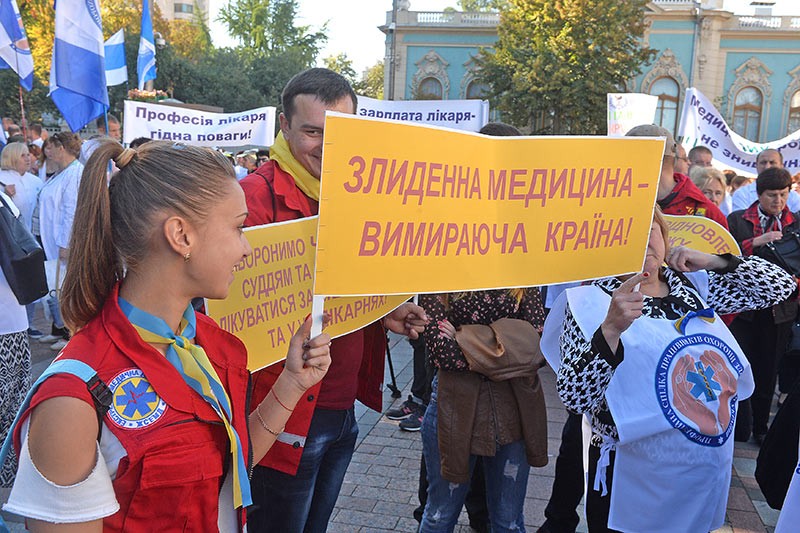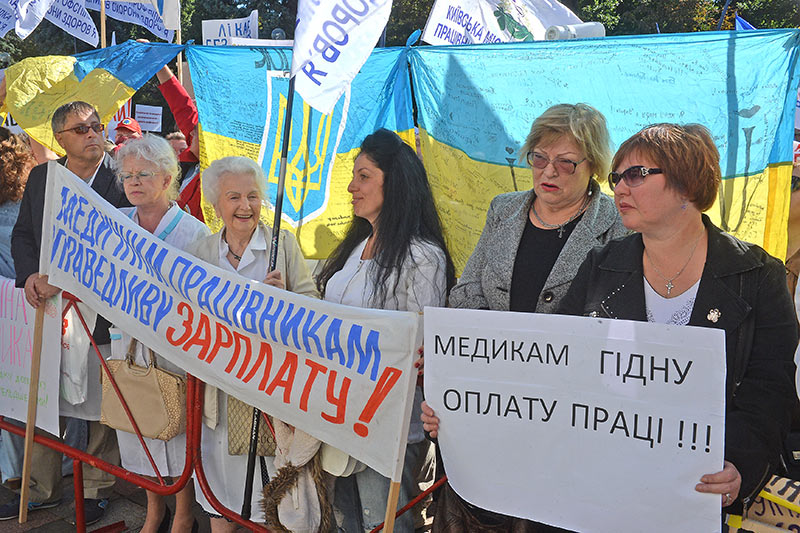 “Лікар без зарплати – ганьба влади”, “Недостатнє фінансування охорони здоров’я – основна хвороба української медицини“, “Наша професія гідна поваги”, “Медикам – гідну зарплату, країні – здорових людей”. З такими вимогами 19 вересня у центрі столиці вийшли на акцію протесту кілька тисяч активістів медичної спільноти.