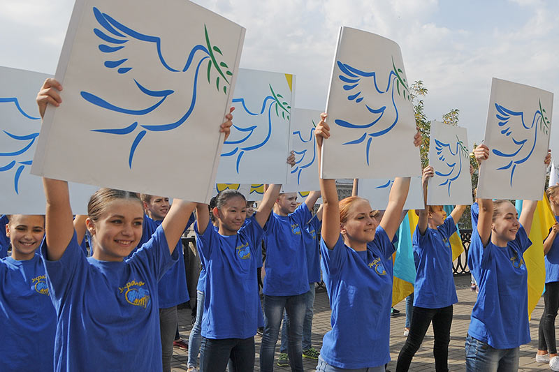 Священики Української православної церкви Київського патріархату, греко-католицької та автокефальної церков відслужили молебень за загиблими та закликали до миру. Також під час флешмобу діти випустили у небо голубів миру.