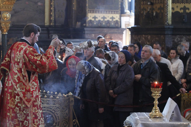 Упродовж всієї служби собор та прилегла територія були наповнені численними богомольцями, а потік бажаючих освятити великодні приношення не переривався.