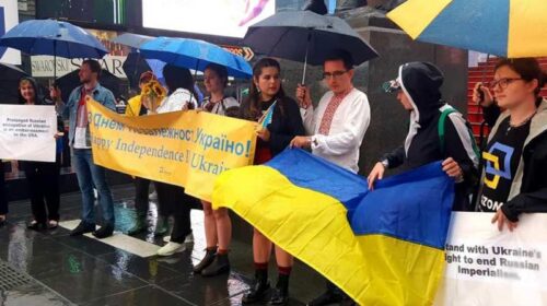 У Нью-Йорку на Таймс-Сквер представники української громади у вишиванках із синьо-жовтими прапорами скандували «Слава Україні – Героям слава!». Як повідомляє Укрінформ, в Нью-Йорку, флешмоб було присвячено Дню Незалежності України. Кількадесят мешканців Нью-Йорка українського походження на заклик волонтерської організації «Разом для України» зібралися в центрі Мангеттена, аби відзначити річницю Незалежності. Учасники акції тримали гасла англійською мовою: «Україна продовжує стікати кров’ю, поки Захід спостерігає», «Тривала російська окупація України – сором для США», «Підтримуйте боротьбу України з російським імперіалізмом».Флешмоб завершився колективним виконанням Гімну України. «Таймс-Сквер – найкраще місце у Нью-Йорку, аби привернути увагу…