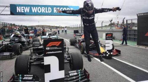 Британський автогонник «Мерседес» Льюїс Гамільтон переміг на 12-му етапі Чемпіонату світу у вищому класі автомобільних перегонів «Формули-1». Перемога на гран-прі в Португалії стала для нього 92-ою за всю кар’єру. Таким чином він побив рекорд німецького автогонника Міхаеля Шумахера за кількістю перемог. Про це повідомляє BBC. Напарник британця у команді Валттері Боттас фінішував другим, третім був Макс Ферстаппен із команди «Ред Булл». Ще 11 жовтня Гамільтон встановив особистий рекорд за кількістю перемог та зрівнявся з Шумахером. Він переміг на гран-прі в Німеччині, для нього це була 91-а перемога. Міхаель Шумахер був…