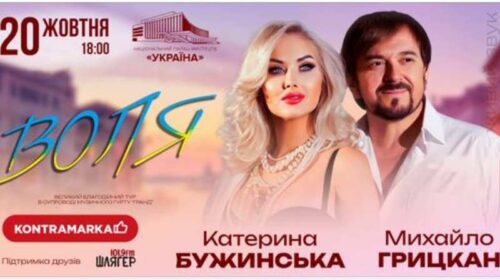 Народна артистка України Катерина Бужинська та Заслужений артист України Михайло Грицкан 20 жовтня виступлять з ексклюзивною концертною програмою на головній сцені України в Національному палаці мистецтв “Україна” наживо у супроводі музичного гурту “ГРАНД”. На рахунку улюблених співаків уже більше тридцяти пісенних зустрічей з гладачами в рамках великого благодійного туру «ВОЛЯ». І завжди панує неймовірна енергетика. Адже народні улюбленці йдуть до глядача зі щирою душею, викладаються на повну в кожній пісні, вони є на одній патріотичній хвилі з незламним українським народом, героїчними Збройними Силами. Глядачі відчувають цю правдивість та щирість, тому й …