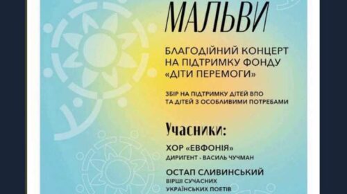 10 жовтня 2024 р. в Домініканському Соборі у м. Львів відбувся благодійний концерт «Мальви» для збору коштів на підтримку дітей ВПО та дітей з особливими потребами. Організатор акції – Благодійна організація”Благодійний фонд “Діти Перемоги”, що з березня 2022 року займається підтримкою дітей із релокованих сімей, дітей з особливими освітніми потребами, дітей-сиріт а також забезпеченням інклюзивних ресурсних центрів спеціалізованим реабілітаційним обладнанням та дидактичними матеріалами. У благодійному заході були задіяні: – хор «Евфонія» під керуванням Чучмана В.М. – поет Остап Сливинський, авторські вірші – Маріанна Винар, Христина Миколюк, вірші «Ніщо так не…
