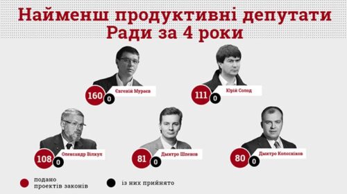 Такого висновку дійшов Комітет виборців України, проаналізувавши співвідношення кількості поданих законопроектів до ухвалених законів, інформує «Український репортер». До уваги бралися виключно законопроекти, проекти постанов не враховувалися. Отже, за чотири роки позафракційний Євгеній Мураєв подав 160 проектів законів, жодного з яких не було прийнято. До п’ятірки найменш продуктивних депутатів також увійшли члени «Опозиційного блоку» Юрій Солод (подано 111/ прийнято 0), Олександр Вілкул (108/0), Дмитро Шпенов (81/0) та Дмитро Колєсніков (80/0). Загалом 48 нардепів за чотири роки не стали авторами жодного ухваленого закону. Серед них Віктор Шевченко (73/0), Вадим Рабінович (53/0), Андрій…