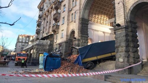 У центрі Києва перекинулась фура з цеглою. ДТП сталася на вулиці Хрещатик. За попередньою інформацією, поки водії відпочивали у вантажівці, авто поїхало вниз. Імовірно, відмовили гальма. «По дорозі фура зачепила автомобіль Toyota, рекламний щит і дорожній знак. Після цього злетіла зі сходів в арці будинку, що по вулиці Хрещатик, 21, навпроти КМДА і перекинулася», – повідомляє “Київ Оперативний“. Зазначається, що в ДТП ніхто не постраждав. Like