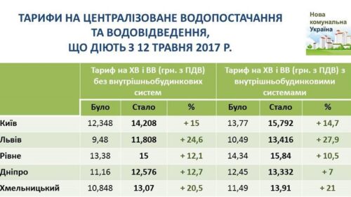 З 12 травня для жителів окремих населених пунктів подорожчала холодна вода і водовідведення. Підвищення тарифів торкнулося 24 водоканалів та їхніх споживачів: Києва, Львова, Рівного, Дніпра, Хмельницького, Ірпеня, Вишневого, Боярки, Кам’янця-Подільського, Павлограда, Лисичанська, Коломиї та інших міст, повідомляє громадська організація “Нова комунальна Україна”. Рівень подорожчання коливається від 7% до 28%. Найбільший відсоток зростання – у Львові, у чисельному вимірі тарифу – у Рівному та Києві. Зокрема, жителям Львова тепер доведеться платити на 27,9% більше. Like