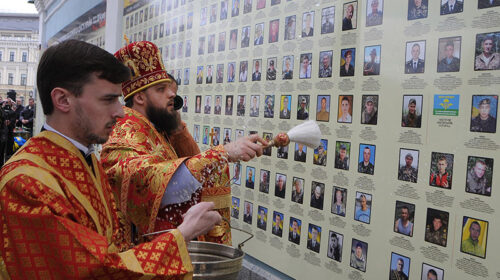 Священики Української православної церкви Київського патріархату освятили „Стіну пам`яті загиблих захисників України, 2014-2017 роки”, яка розташована на мурах Київського Михайлівського Золотоверхого Собору. На 11 частинах „Стіни пам`яті” розміщено фотографії та біографії майже трьох тисяч загиблих військовослужбовців Збройних Сил України, Національної гвардії, Державної прикордонної служби, працівників МВС та Нацполіції, добровольців. Фото Олексія ІВАНОВА Like