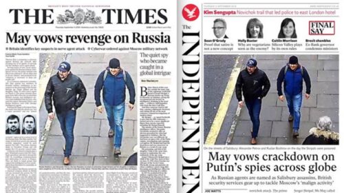 Провідні британські газети розмістили на першій шпальті фотографії підозрюваних в отруєнні Сергія Скрипаля та його дочки Юлії, повідомляє Цензор.НЕТ із посиланням на російського журналіста Андрія Мальгіна. Учора прем’єр-міністр Великої Британії Тереза Мей назвала Олександра Петрова і Руслана Бошарова офіцерами Головного розвід управління Генштабу РФ. «Це не просто злочинна операція. Найімовірніше, її було схвалено на вищому рівні російської влади», – додала вона. Тим часом у британській поліції заявляють: «Є достатньо підстав пред’явити обвинувачення російським громадянам Олександру Петрову і Руслану Бошірову у змові з метою вбивства в Солсбері за допомогою отруйного газу».…