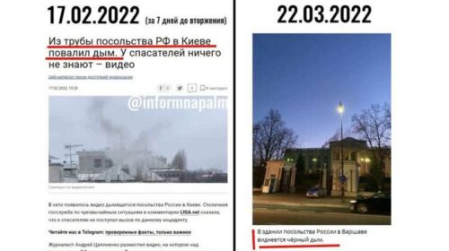Над будівлею посольства Росії у Варшаві помітили дим. За тиждень до вторгнення в Україну у посольстві РФ в Києві також бачили дим. Про це пише у Фейсбуку керівник InformNapalm Роман Бурко. “Звичайно, гадати тільки по диму з труби російського посольства ми не будемо, але наші інсайдери вже кілька днів передають відомості, нібито РФ планує удар по Польщі та Литві. Ряд непрямих ознак вказують, що горище у Кремля зовсім поїхало і нахрапом Росія намагається прискорити період свого напіврозпаду, втягнувши у війну вже низку країн НАТО, намагаючись “взяти на слабо” і перевірити…