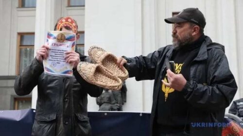 Читати даліПід Верховну Раду мітингарі принесли Разумкову російські лапті і “грамоту” Московії