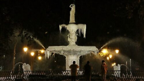 На півдні американського штату Джорджія вперше за майже 30 років випав сніг. Він супроводжувався різким зниженням температури повітря, тож у парку Форсіт у місті Савана замерз фонтан. У Савані скасовано заняття в школах, закрито багато магазинів й офісів. У 27 округах Джорджії оголосили режим надзвичайного стану. Через різке похолодання фонтани замерзли і в інших містах на південному сході США, у тому числі в Новому Орлеані, Чарльстоні і Шарлотті, де температура повітря взимку рідко опускається нижче 0 градусів за Цельсієм. People launching LastQuake app after M4.5 #earthquake. They react to ground…
