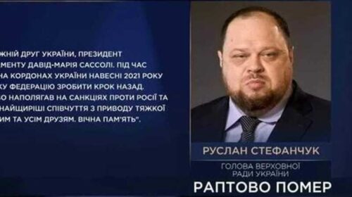 Парламентський телеканал “Рада” під час прямої трансляції 11 січня ввів в оману телеглядачів, продемонструвавши фотографію голови Верховної Ради України (ВРУ) Руслана Стефанчука під час повідомлення про смерть голови Європарламенту Давида Сассолі. У зв’язку з невдалою версткою текстових і графічних блоків, рухомий рядок із повідомленням про смерть Сассолі “загубився” на тлі великого зображення Стефанчука. У підсумку глядачі могли прочитати текст “Руслан Стефанчук. Голова Верховної Ради України. РАПТОВО ПОМЕР”. Ліворуч на екрані розміщено текст співчуття, у якому Стефанчук повідомляє про те, що пішов із життя справжній друг України, президент Європарламенту Давид Сассолі.…