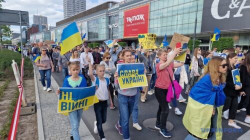 Тисячі українців, поляків та представників інших національностей зібралися у неділю 8 травня в центрі Варшави на акцію протесту проти російської агресії в України під назвою “Россия, иди на х..”. Вони пройшли маршем від Палацу культури та науки до посольства рф, скандуючи гасла на підтримку України та вимагаючи врятувати захисників Маріуполя, які перебувають на комбінаті “Азовсталь”. Учасники акції йшли з українськими прапорами та плакатами на кшталт “Врятуйте Азовсталь”, “Стоп путін”, “Стоп війні”, “Будь сміливим, як Україна”, “Побороли нацизм – поборемо і рашизм”, “Русский военный корабль, или на х..” тощо. Учасники акції…