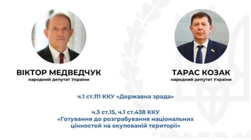 Генеральний прокурор Ірина Венедіктова підписала підозру в держзраді куму Путіна голові політради партії “Опозиційної платформи – За життя” Віктору Медведчуку та нардепу ОПЗЖ Тарасу Козаку. Сьогодні, 11 травня, СБУ провела обшук в будинку голови Віктора Медведчука по вулиці Монтажників у Києві, повідомляв “Український репортер”. СБУ інформує: “Оскільки обидва фігуранти відсутні за місцем проживання та у зв’язку з неможливістю безпосереднього вручення письмових повідомлень про підозру, їх скеровано до останніх відомих місць проживання, а також до адміністрації за місцем їх роботи (тобто у Верховну Раду України). Зокрема, Медведчук і Козак підозрюються у…