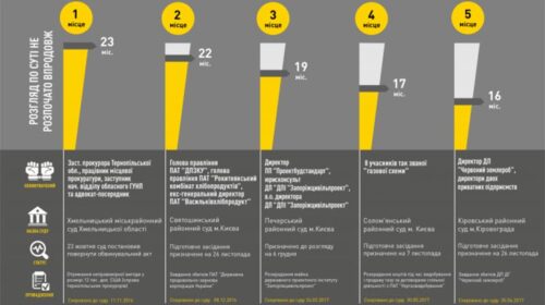 З-поміж 166 кримінальних проваджень, у яких на кінець жовтня детективи НАБУ завершили досудове розслідування, а прокурори САП скерували обвинувальні акти до суду, у 48 справах навіть не відбулося підготовче засідання. Про це інформує «Український репортер» із посиланням на НАБУ. Засідання відкладаються й переносяться з різних причин: об’єктивний брак суддів, нез’явлення, хвороби або відпустки учасників процесу тощо. Своєрідний «антирейтинг» очолює справа «тернопільських прокурорів»: провадження не розглядається з 11 листопада 2016 року. Майже 22 місяці зволікають зі справою про обвинувачення посадовців у завданні збитків ПАТ «Державна продовольчо-зернова компанія». «Лише у 35 провадженнях…